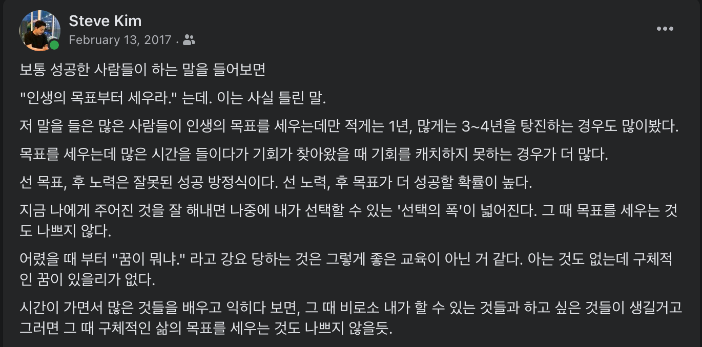 하지만 그렇다고 대충 살라는 말이 아니다. 지금 당장 내 앞에 주어진 것들을 누구보다 잘 한다면 불확실한 미래들에서 나오는 기회들을 포착할 수 있을 것이다. 지금 내가 블로그에 글을 쓰는 것도 결국엔 지금 내가 하고 싶은 것을 하는 것일 뿐이지 구체적으로 어떤 목표를 세워서 그 목표를 이루기 위한 세부 목표의 일부가 아니다. 그저 블로그에 다양한 글을 담다보면 나중에 도움이 되겠지하는 생각 뿐이다. 여태까지 시도하고 도전해서 안좋았던 것들은 없었던 거 같다.