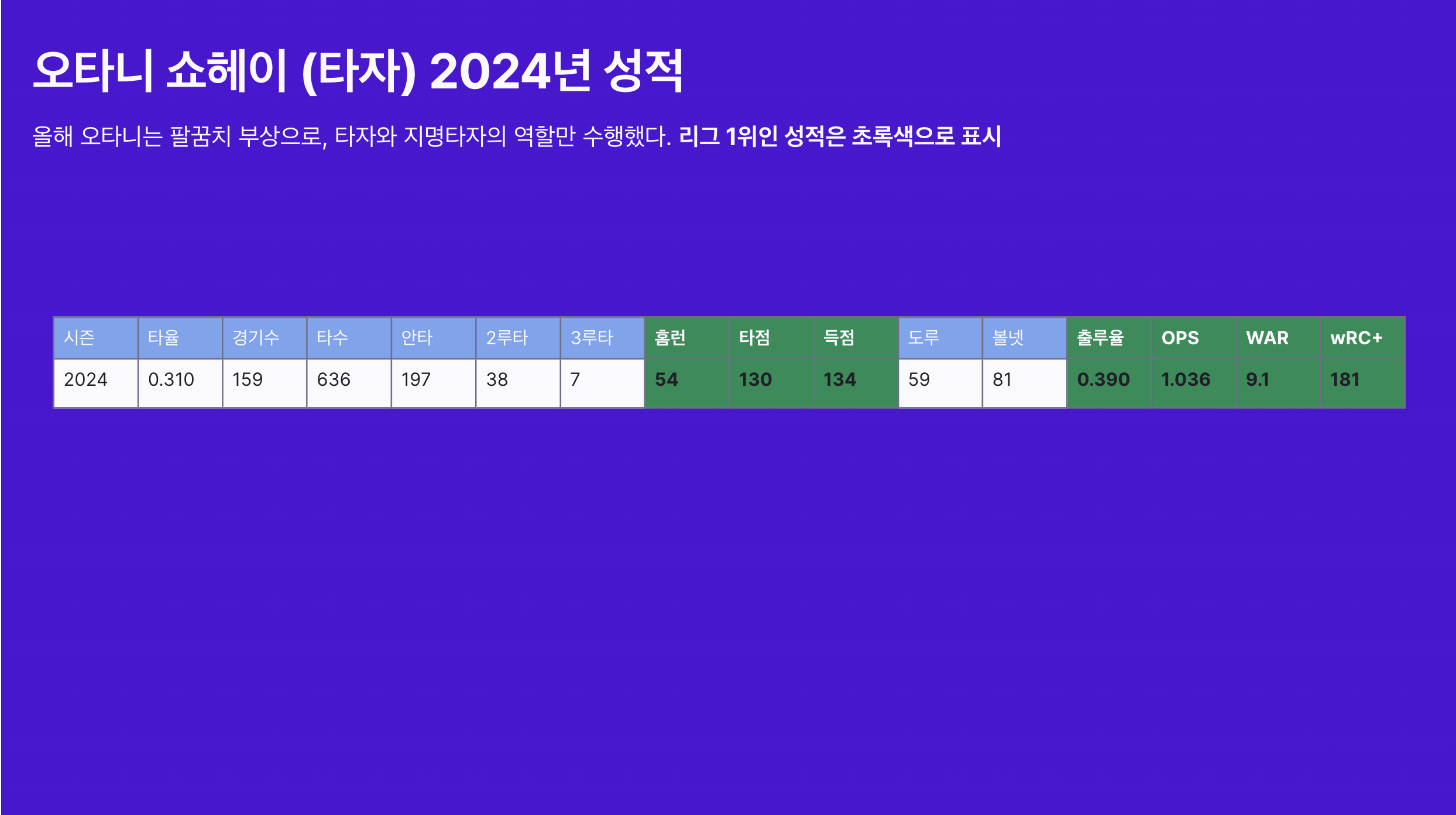 우선 필자가 가장 좋아하는 오타니 쇼헤이의 2024년 성적이다.
