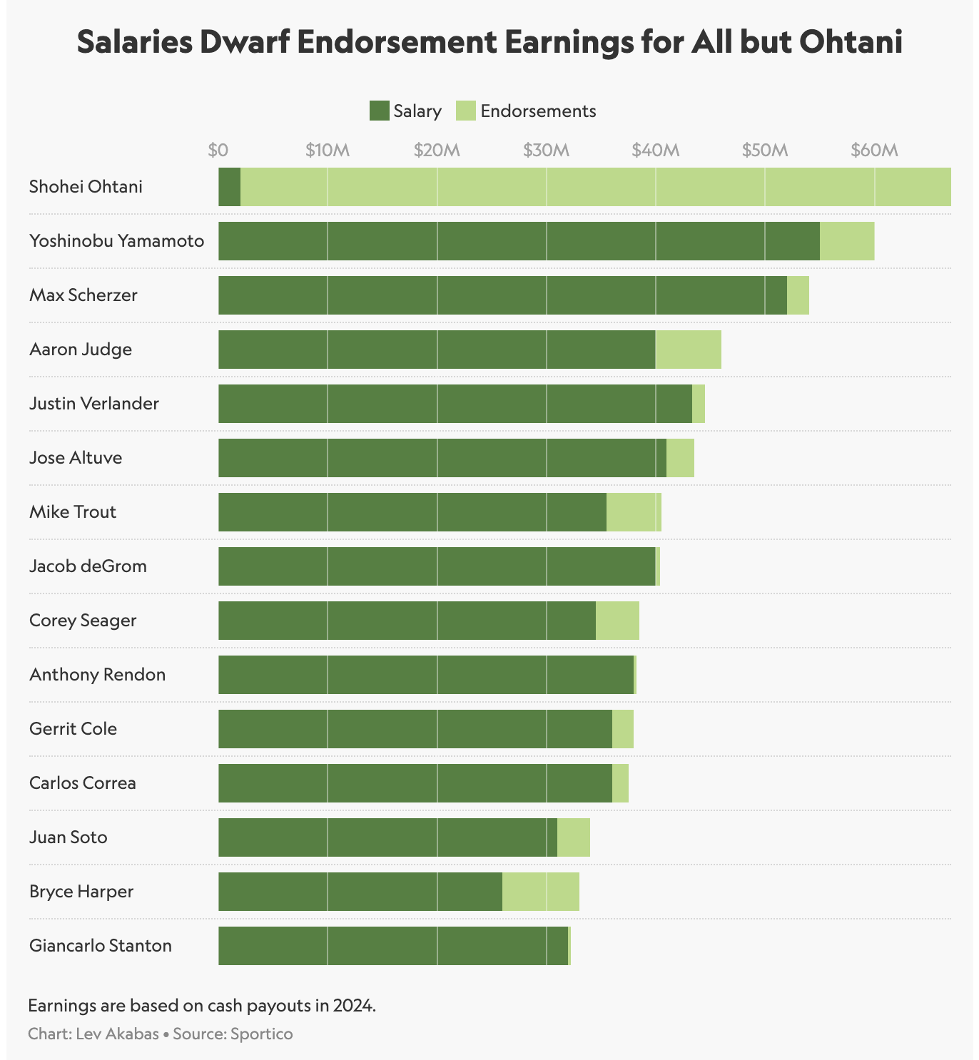 4)스폰서십 등, 스포츠 외적으로 창출하는 가치가 제일 높은 MLB 선수 역시 오타니 쇼헤이다(애런 저지는 4등. 심지어 이 그래프는 오타니가 연봉 지급을 10년 늦췄는데도 불구하고 MLB에 있는 모든 선수들보다 높은 수익을 창출하는 것이다. 만약 오타니가 연봉 지급 유예가 아니라, 6억 달러를 전부 받는다고 한다면 오타니의 수입은 혼자서 다른 세상에 가 있는 정도).