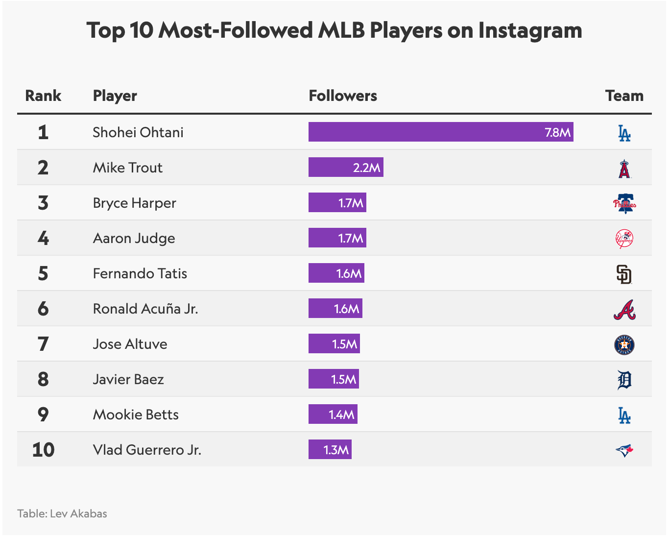 3) 오타니 쇼헤이는 MLB 선수들 중에서 SNS 팔로워가 가장 많은 선수이다(오타니 832만, 애런 저지 187.5만)