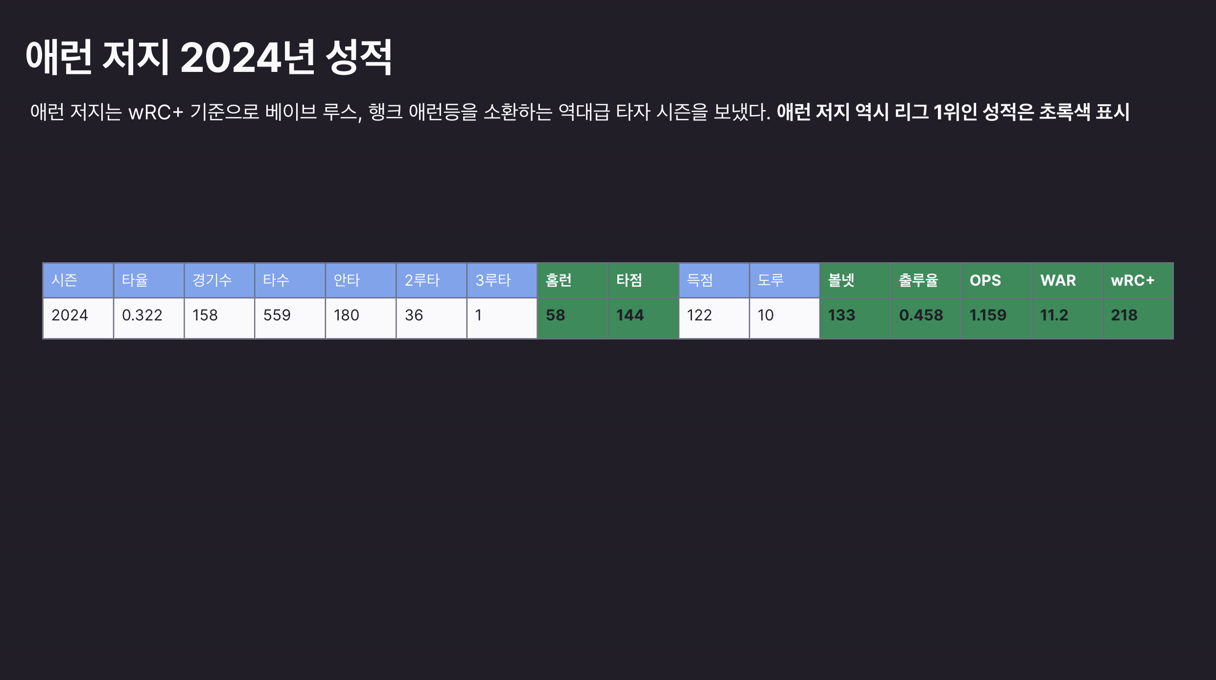 그다음은 역대급 타자 시즌을 보내고 있는 애런 저지의 올해 성적이다.